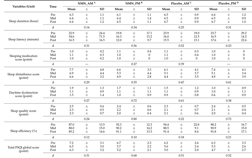 表1:补充NMN或安慰剂对四组睡眠质量的影响
