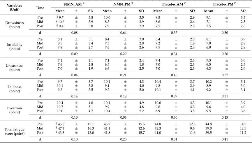 补充12周后,下午补充NMN的老年人嗜睡、不稳定性(无法集中注意力)和总疲劳明显减少,这说明老年人的注意力和认知能力得到了大幅提高而上午补充NMN的老年人依然是毫无变化。