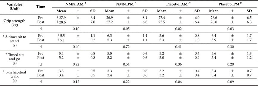 表3 补充NMN或安慰剂对四组身体机能的影响