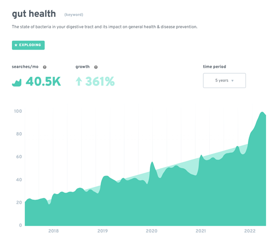 消费者对肠道健康关注度不断提高,Exploding topics相关数据显示,近五年内,“肠道健康(GUT HEALTH)”的社交平台搜索量在增长了361%。