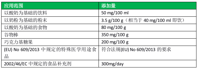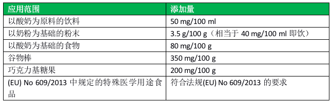 可用于牛奶,风味牛奶,牛奶饮品,替代奶(豆奶),酸奶,谷物棒,果味饮品,添加量100mg/份,用于谷物早餐,添加量50mg/份。