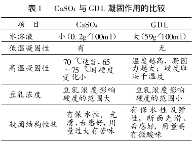 用葡萄糖酸-δ-内酯作为蛋白质凝固剂生产豆腐,质地洁白细嫩,无传统用卤水或石膏所具有的苦涩味,无蛋白质流失,豆腐出率高,且使用方便。有关使用CaSO4与GDL的比较如下:
