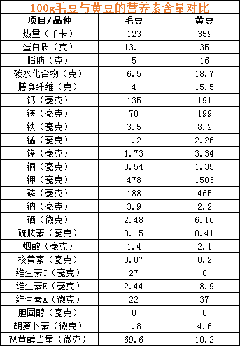 从营养价值上看,黄豆比毛豆优秀多了。除了钠、维生素C、视黄醇当量,大豆的含量低于毛豆,其他大部分营养素大豆含量几乎可达到毛豆含量的3倍左右。