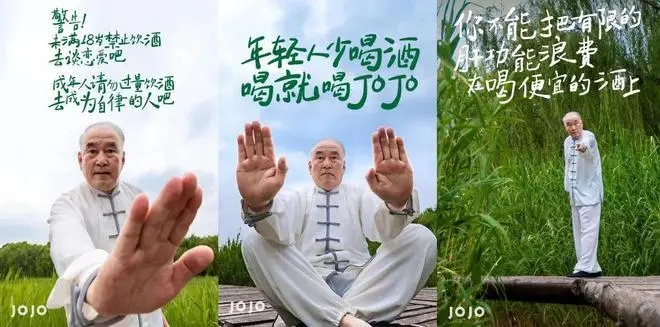 在一则父亲节短片中,一位面带严肃的大爷一边打着养生拳,一边一本正经地重复:“年轻人少喝酒,喝就喝JOJO”。