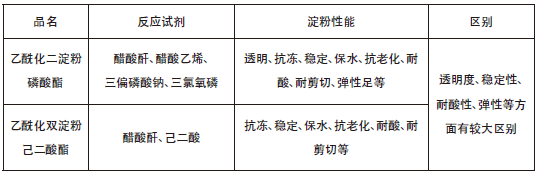 乙酰化二淀粉磷酸酯是以醋酸酐或醋酸乙烯为酯化剂,以三偏磷酸钠或三氯氧磷为交联剂制备的变性淀粉,乙酰化基团的接入带给淀粉冻融稳定性、保水性、持水性、弹性等优良性能,磷酸酯交联键则带给淀粉耐高温、耐剪切、耐酸、稳定等性能,且交联度的变化也对制品的口感起到至关重要的作用。