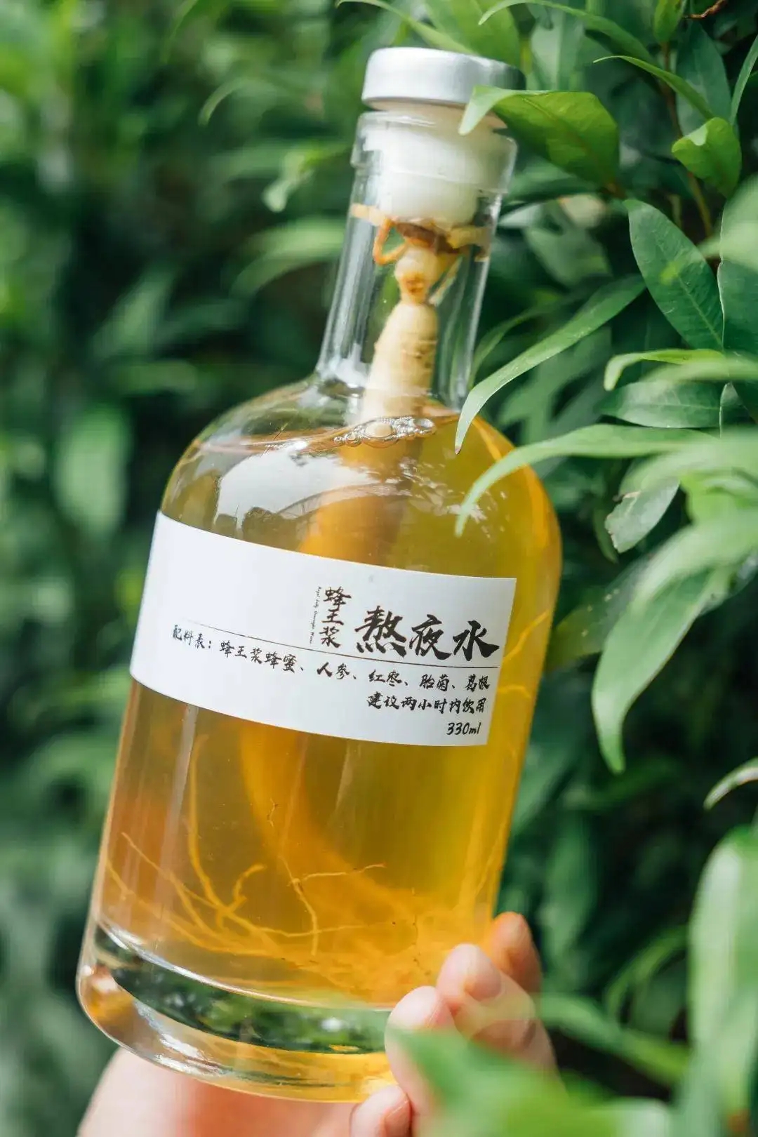 姑且不论这些食材是否有用户预想的价值和「脱开剂量谈影响都是耍流氓」两点,蜂王浆熬夜水火了开始也就有新茶饮从业者开始拆解它红火的原因。既然蜂王浆、玻璃瓶包装都不少见,那么一根完整的人参就是它杀出重围成为C位的关键原因。