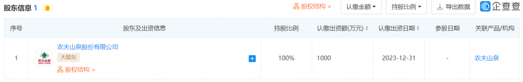 股东信息显示,该公司由农夫山泉股份有限公司全资控股,认缴出资额为1000万元。
