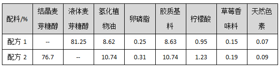 由于麦芽糖醇的风味口感好,具有良好的保湿性和非结晶性,可用来制造各种糖果,包括发泡的棉花糖、硬糖、透明软糖等。现例举麦芽糖醇制造糖果配方如表2: