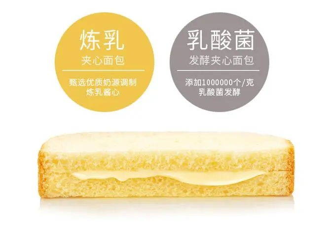以面包专用粉为主要原料,添加乳酸菌、酵母等辅料。采用二次发酵工艺生产面包。面包内部组织柔软、细腻,纹理结构好,发酵香味浓郁且有柔和的乳酸味,且具有良好的抗老化的特性,其品质优于普通面包具有较大的开发前景。