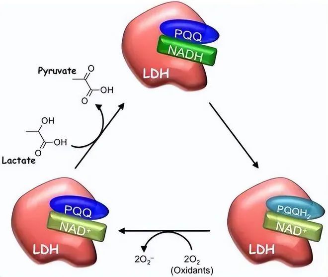 PQQ是许多不同酶,及其催化反应的辅助因子;PQQ在人体中调节的一种重要酶是乳酸脱氢酶(LDH)。