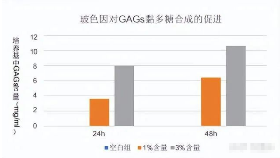 添加3%玻色因培养基中黏多糖GAGs24h增长8.0mg/ml, 48h增长10.6mg/ml,因此玻色因促进表皮细胞分泌黏多糖。