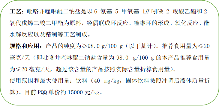 2022年3月,国家卫健委2022年第1号公告,《关于关山樱花等32种“三新食品”的公告》,批准吡咯并喹啉醌二钠盐<Pyrroloquinoline quinone disodium (PQQ)salt.>为新食品原料,可应用于饮料领域。