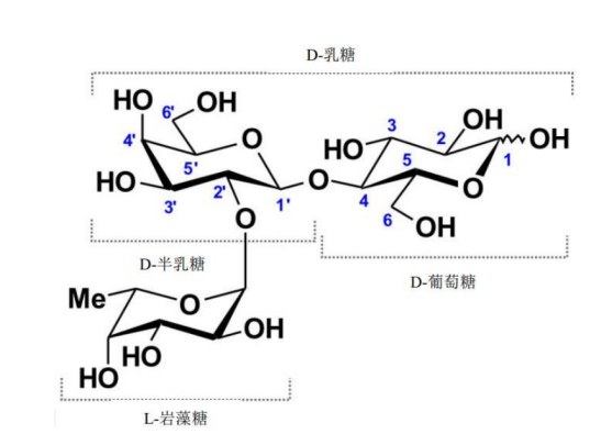 研究发现,人类母乳中 HMOs 由 5 种单体组成:D- 葡萄糖(D-glucose,Glc)、D-半乳糖(D-galactose,Gal)、N-乙酰氨基葡萄糖(N-acetylglucosamine,GlcNAc)、L-岩藻糖(L-fucose,Fuc)和唾液酸(sialic acid,SA),这5种单体以不同比例结合,构成母乳中上千种HMOs。