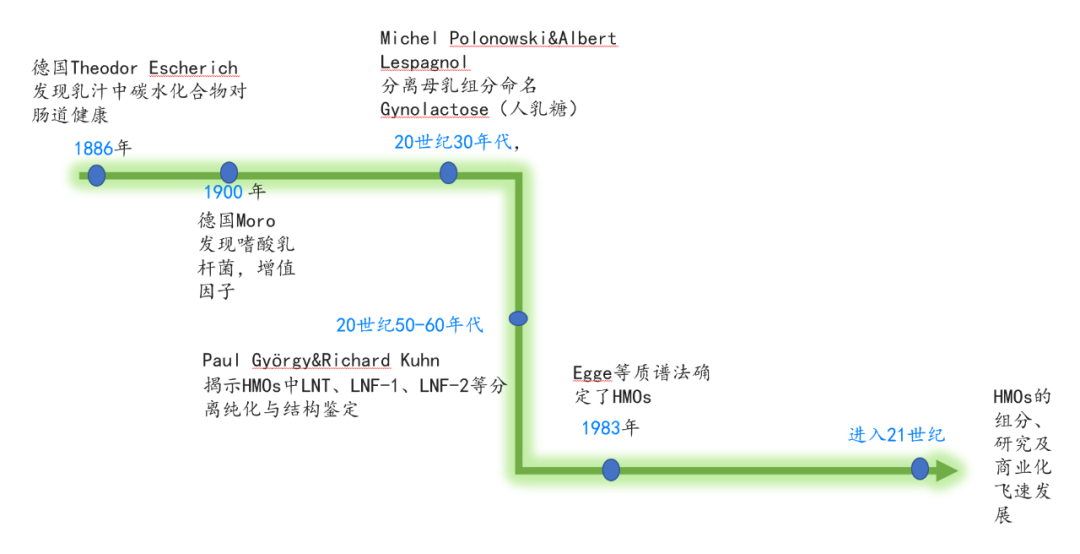 1900年德国Theodor Escherich的学生Moro发现,母乳中含有促进双歧杆菌增殖的因子。1954年Gyorgy证实,促进双歧杆菌增殖的因子大约是10个单糖组成的碳水化合物,当时称为“人乳糖”,后来科学界逐步揭示了HMOs的本质,对“双歧因子”HMOs中LNT、LNF-1、LNF-2等多个含氮单体成分做了分离纯化与结构鉴定。