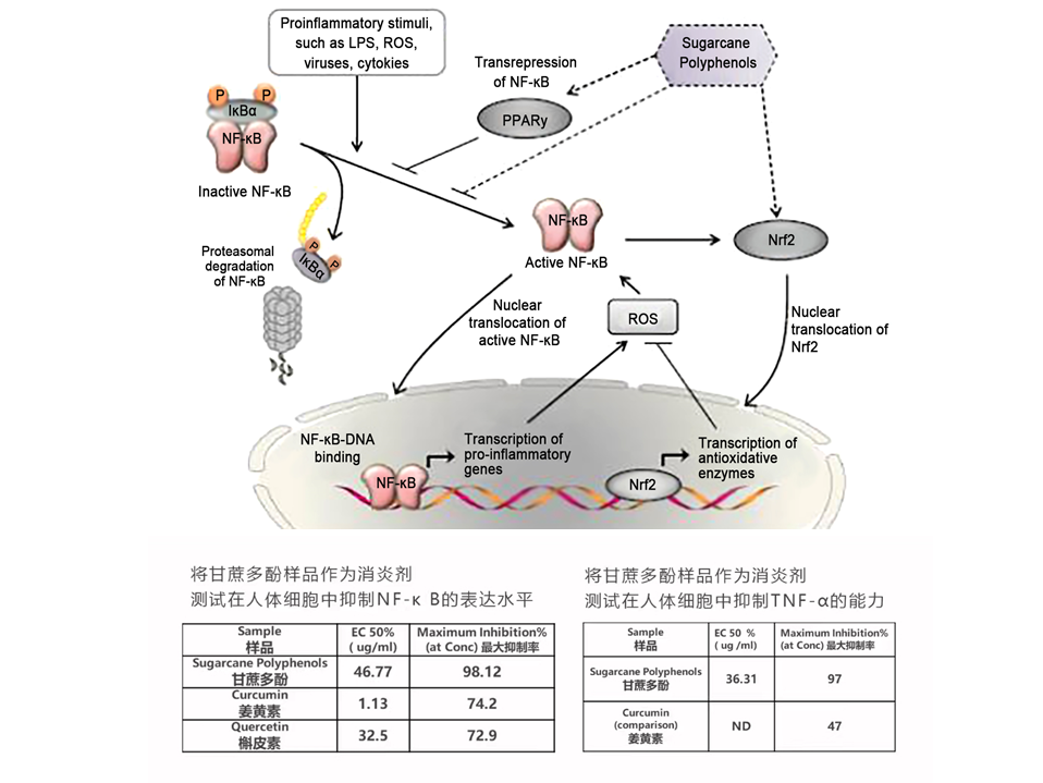 作为多酚类物质,甘蔗多酚具有抗氧化、抗炎的重要功效。由于富含从甘蔗中提取的、易被人体吸收利用的稳定小分子复合多酚,甘蔗多酚能够有效清除自由基,具有超强的细胞抗氧化活性。同时,多酚物质具有抑制促炎细胞因子的作用,相关实验证明甘蔗多酚有助于对抗炎症、肥胖和其它疾病。