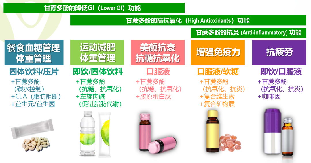 由此可见,甘蔗多酚作为一种植提新食品原料,具有降低食品饮料GI值的作用,还具有抗炎、抗氧化的功能性优势,能广泛应用于各类食品饮料中。