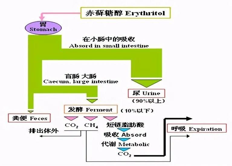 进入大肠内的碳水化合物被肠道细菌发酵后产生挥发性脂肪酸CH4和H2。其中CH4和H2可溶解入血液中,并通过呼气排出。研究表明,摄入赤藓糖醇后,呼气中H2的数量并没增加。而摄入乳糖醇后,呼气中H2的数量明显增多。这表明,进入大肠中的少量赤藓糖醇很难被细菌发酵利用。