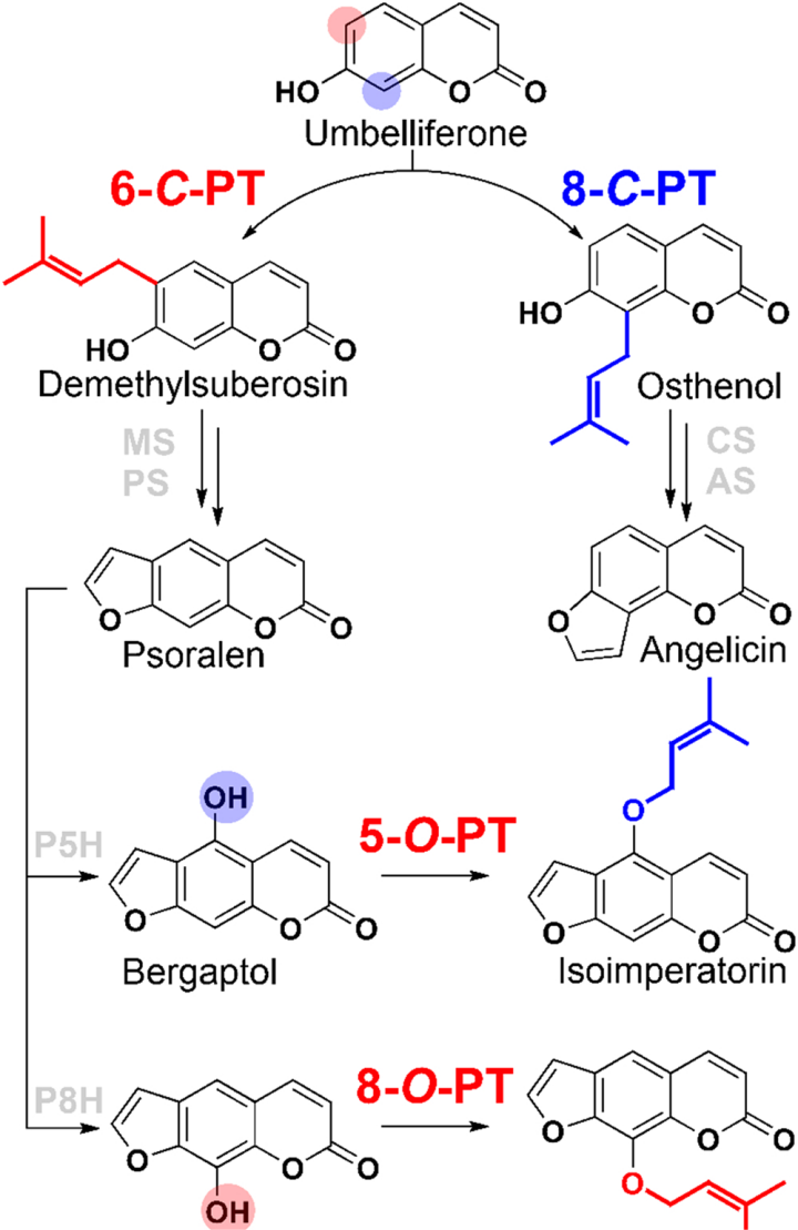 近日,中国药科大学研究团队在Industrial Crops & Products杂志发表了题为“Three carbon-/oxygen-prenyltransferases responsible for furanocoumarin synthesis in Angelica dahurica”的研究论文,该研究通过公共转录组挖掘,生物信息学分析,体外功能验证等方法成功克隆并表征其生物合成过程中的关键酶——异戊烯基转移酶,为香豆素异戊烯化修饰提供了新的见解。