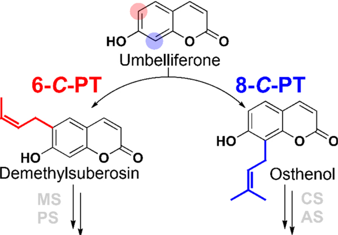 研究团队首先根据欧前胡素与异欧前胡素的化学结构分析,推测其在植物中的生物合成途径(图一)。然后基于白芷转录组分析,通过NCBI以及本地blast等线上软件分析成功筛选了功能注释为异戊烯基转移酶的候选序列,分别构建到原核表达载体pETDUET上进行异源表达,通过液相及质谱确认,成功筛选了两种异戊烯基转移酶,一种识别底物伞形酮生成去甲基软木花椒素(C-异戊烯化),另一种识别底物花椒毒酚生成欧前胡素(O-异戊烯化)。