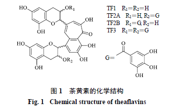 茶黄素是存在于发酵茶中的一种金黄色色素,为茶叶发酵产物[1]。茶黄素在茶汤鲜亮的颜色和浓烈的口感方面起到了一定的作用,是决定红茶品质、等级和质量的重要成分[2]。由于茶黄素具有多种与人体健康有关的功能,如抗氧化、调血脂、抗炎、降尿酸、抗病毒、抗菌和抗癌等,因而受到国内外的广泛关注,成为茶叶中功能成分的研究热点。国际上绝大多数茶叶提取物、茶多酚、茶黄素、茶氨酸、速溶茶粉等都是中国生产,但大部分都是出口国外,去生产茶系列功能食品。我国工业茶制品仅有冰红茶、冰绿茶、原味茶饮等具有一定茶风味的饮料,真正具有功效的茶制品很少,与日本茶叶制品遍地开花形成巨大的反差。如何科学合理的对茶叶成分进行配伍研发生产功效可靠的茶系列健康食品,是未来发展的一个方向。本文以茶黄素结构的认识为出发点,综述茶黄素的生物活性,关注茶黄素在保健食品、医药等领域中的科学研发与应用,以期为茶黄素的应用开发提供参考。