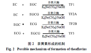 茶黄素具有很好的药用价值和经济价值,但是茶黄素的粗提物价值较低,要提升其价值需要提高茶黄素的纯度。茶黄素一般从红茶中提取分离,其得率低,分离纯化困难,原料浪费大且加工成本高。提取获得高含量的茶黄素已成为医药和保健食品领域研究的重要方向。由于其结构的相似性,直接从红茶中分离出茶黄素单体非常困难。因此,采用以儿茶素为底物,运用酶促氧化法或(和)化学氧化法合成茶黄素是实现高产量、高纯度茶黄素的关键。由于儿茶素的酶氧化作用,茶黄素家族由28个或更多成员组成。其中TF1、TF2A、TF2B和TF3占主导地位。如图2所示,对这4种主要茶黄素化学成分的生产进行了图解。以表儿茶素(EC)、表儿茶素没食子酸酯(ECG)、表没食子儿茶素(EGC)和表没食子儿茶素没食子酸酯(EGCG)4种物质为前体,通过其中两者的二聚化生成茶黄素[4]。茶黄素的合成方法和反应条件:将2 g EC和4 g EGC溶解于600 mL水中,然后通过混合等量的铁氰化钾水溶液(3.08 g/10 mL)和碳酸氢钠水溶液(0.78 g/10 mL)制备30 mL氧化剂,在冰冷却条件下逐滴加入到儿茶素溶液[5]。