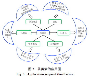 近年来,茶黄素的生物活性、药用价值及其保健功能逐渐被认识和开发。茶黄素具有多种生理功效,如抗氧化、调血脂、抗炎、降尿酸和抗病毒等。茶黄素应用于保健食品、医药、化妆品等领域,并且随着茶黄素更多生理功效的发现与研究,相应地保健食品、医药应用领域也将进一步拓宽。