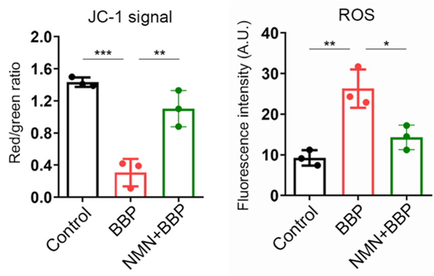 科研人员发现,暴露于BBP会使小鼠卵母细胞内的线粒体电压降低,造成线粒体的健康状况不佳。然而,通过给小鼠注射200mg/kg/天的NMN,则可以逆转这种电压的降低,维持线粒体的健康。