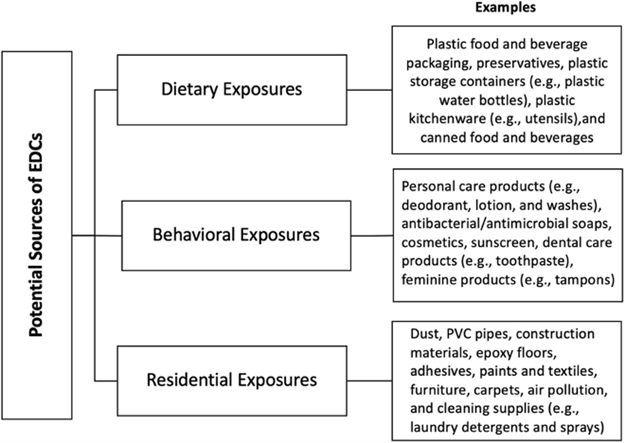膳食暴露:塑料食品和饮料包装、防腐剂、塑料储存容器(如塑料水瓶)、塑料厨具(如器皿)、罐头食品和饮料等;