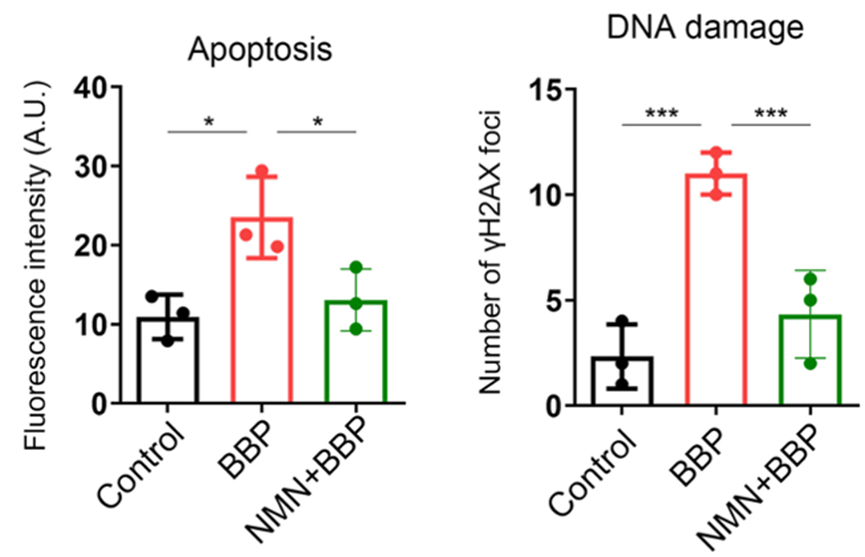 不仅如此,伴随着衰老,氧化应激会导致DNA损伤的累积,从而加剧了衰老的进程。当受损线粒体的电压达到特定阈值时,细胞则会死亡。实验亦发现,在BBP暴露小鼠的卵母细胞中,细胞死亡和DNA损伤均有所增加;而NMN则能防止这两种老化特征的发生。