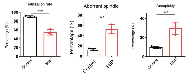 此外,科研人员发现,来自BBP暴露小鼠的卵母细胞的纺锤体解体和非整倍体均有所增加。其中,非整倍体-染色体数量异常,是造成流产和发育障碍的主要原因。非整倍体被认为是卵母细胞衰老的标志,随着年龄的增长,它会增加50%。而导致非整倍体的衰老卵母细胞的另一个特征是纺锤体(有助于平均分裂染色体的蛋白质)组织不良。