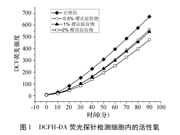 实验中,樱花提取物组的荧光强度均低于对照组,可以看出樱花提取组的氧自由基比对照组减少。