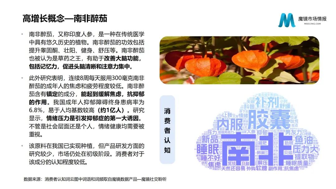 - 南非醉茄相关产品是指以南非醉茄为原料的食品、饮料、保健品等,因其具有情绪支持、提神等作用而受到消费者的追捧。