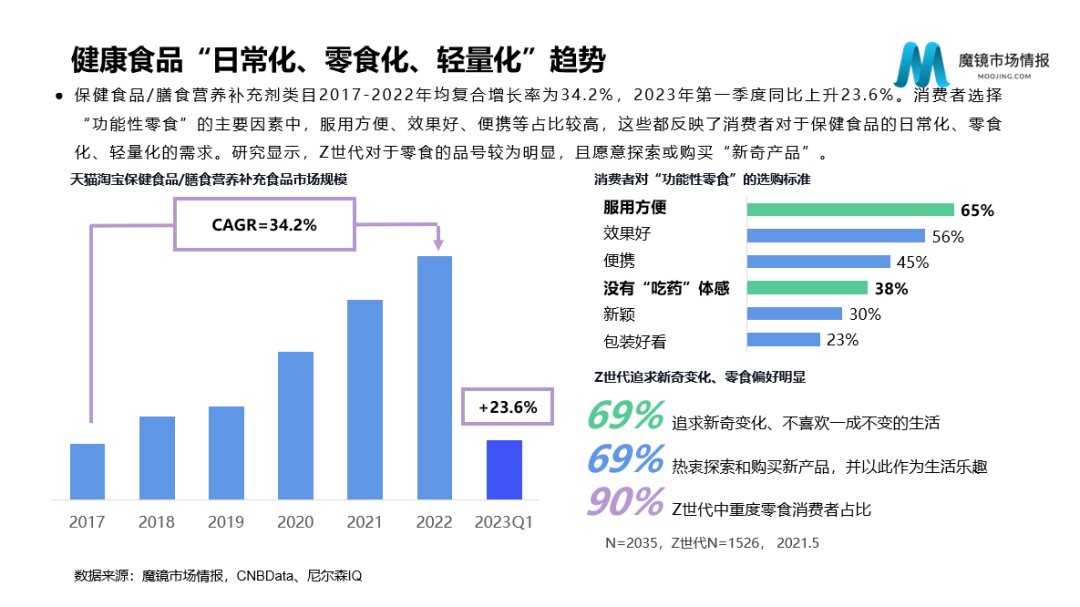- 聚焦健康食品热门赛道,“零食化”趋势愈演愈烈,通过对海外产品形态、成分复配等方面洞察为口服美容市场和体重管理等市场发现新机会点。