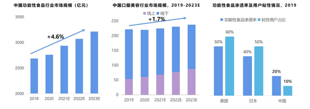 据预测,中国功能性食品市场2023年将超3200亿元,口服美容市场则逼近240亿大关,后疫情时线上渠道占比将超三成,并有进一步提升的可能性。对比美国、日本的功能性食品渗透率,中国渗透率较低,仅为日本市场的一半,而粘性用户的占比仅10%,市场存在较大的上升空间。