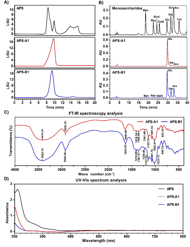综合运用高效凝胶过滤色谱、高效液相色谱、红外光谱、紫外-可见光谱对均一多糖进行结构表征。结果表明,APS-A1和APS-B1的平均分子量分别为2.62×106Da和4.95×106Da。APS-A1主要由葡萄糖组成,APS-B1主要由葡萄糖、半乳糖、阿拉伯糖组成,摩尔比为75.2∶17.3∶19.4。FT-IR光谱展示了APS-A1和APS-B1具有多糖化学键和官能团的特征吸收峰,并证实含有α型糖苷键。紫外-可见光谱表明它们不含核酸和蛋白质,与化学分析的结果一致。