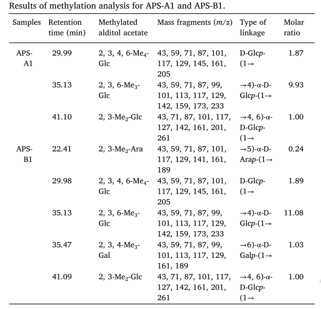 为了进一步获得有关它们结构的信息,通过甲基化和GC-MS鉴定了糖苷键类型。结果显示,APS-A1主要含有T-Glcp、1,4-Glcp和1,4,6-Glcp 3种糖残基,摩尔比为1.87∶9.93∶1.00。APS-B1包含5种残基,分别是1,5-Araf、T-Glcp、1,4-Glcp、1,6-Galp和1,4,6-Glcp残基,摩尔比为0.24∶1.89∶11.08∶1.03∶1.00。