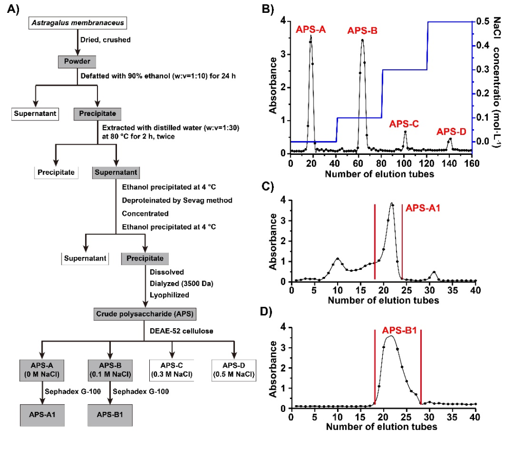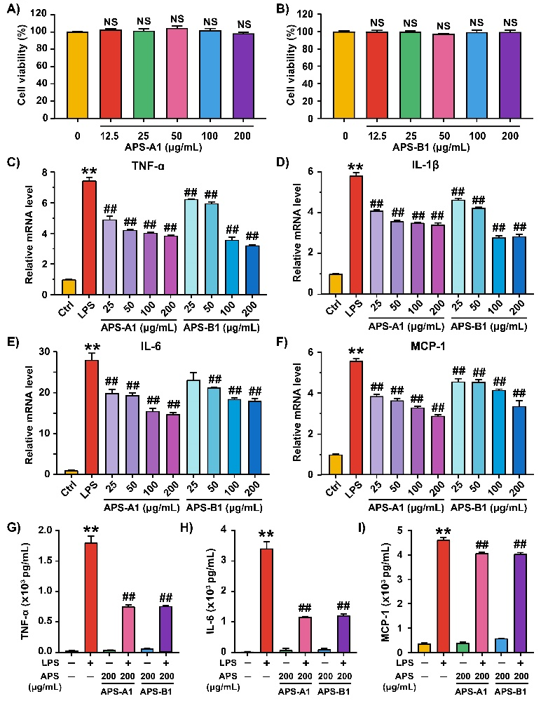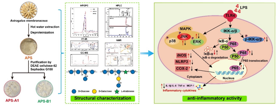 在本研究中,从黄芪中分离得到两种均一的多糖APS-A1和APS-B1,并对其一级结构进行表征。同时证明二者具有良好的抗炎活性,可以通过抑制NF-κB和MAPK(ERK,JNK)信号通路,抑制炎症细胞因子(TNF-α、IL-6和MCP-1)的表达和分泌。这些结果表明APS-A1和APS-B1具有良好的抗炎活性,可以作为一种潜在的抗炎补充剂。二者活性的差异可能与其结构特征有关,进一步的研究将集中在它们的生物活性和构效关系上。