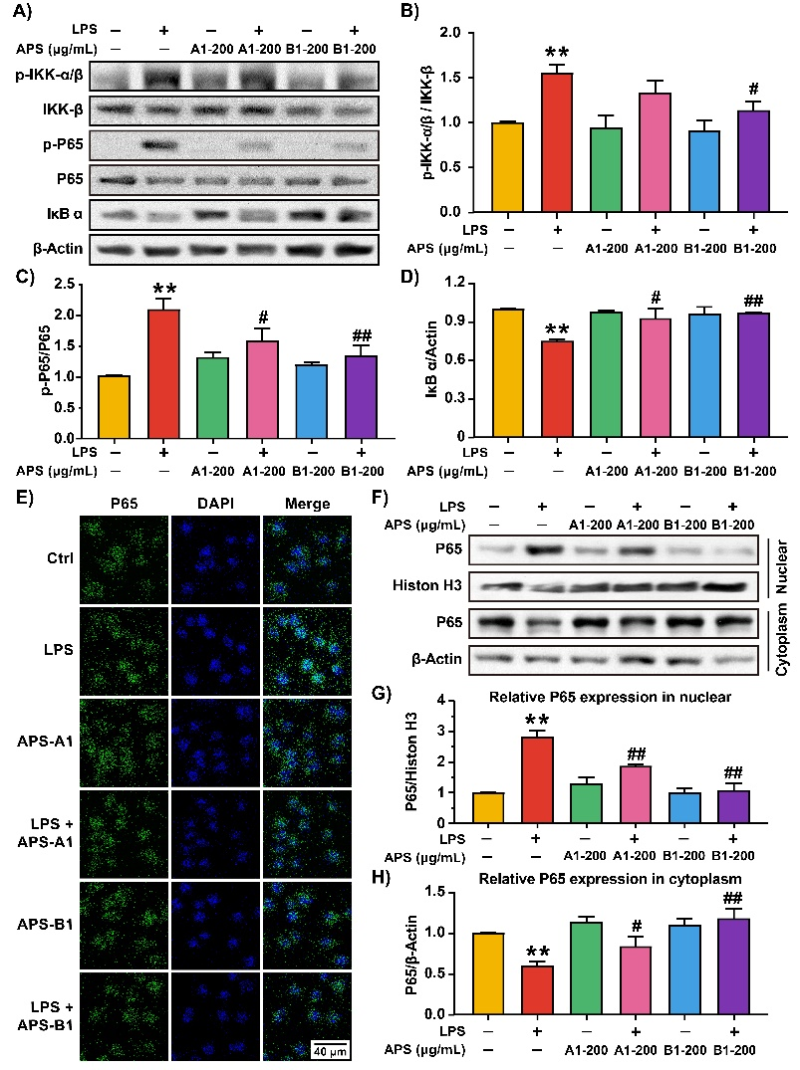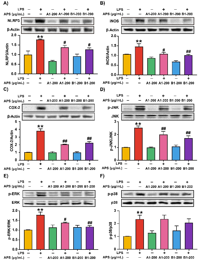 基于LPS诱导的RAW264.7巨噬细胞模型,进一步研究了黄芪均一多糖的抗炎活性。研究表明APS-A1和APS-B1在体外具有良好的抗炎活性,可以抑制炎症细胞因子(TNF-α、IL-6和MCP-1)的表达和分泌,其机制是抑制NF-κB和MAPKs(ERK,JNK)信号通路来实现的。