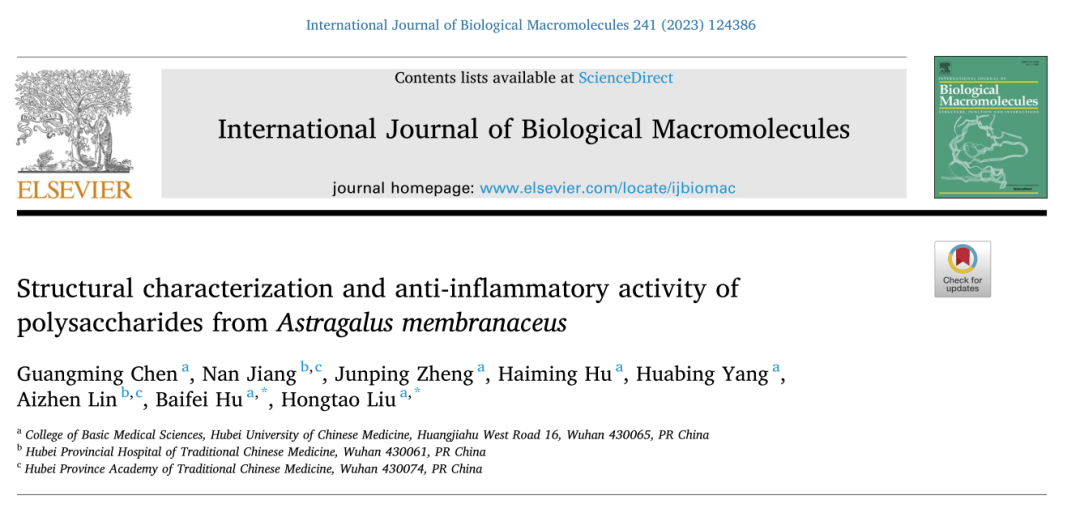 近日,湖北中医药大学刘洪涛教授团队在国际著名学术期刊《International Journal of Biological Macromolecules》(Top一区,IF=8.03)发表题为“Structural characterization and anti-inflammatory activity of polysaccharides from Astragalus membranaceus”(DOI:10.1016/j.ijbiomac.2023.124386)的研究性论文。
