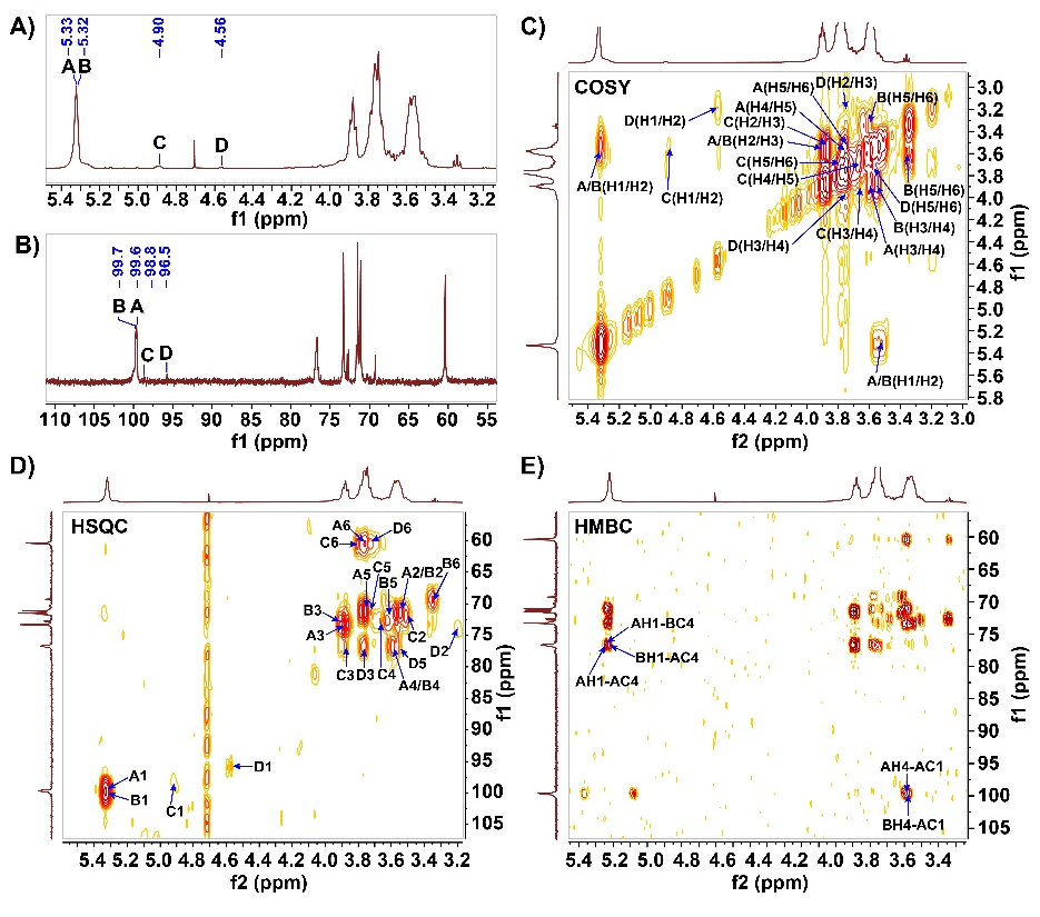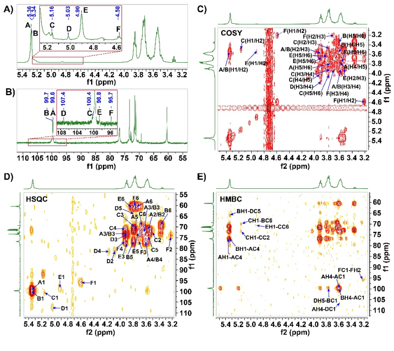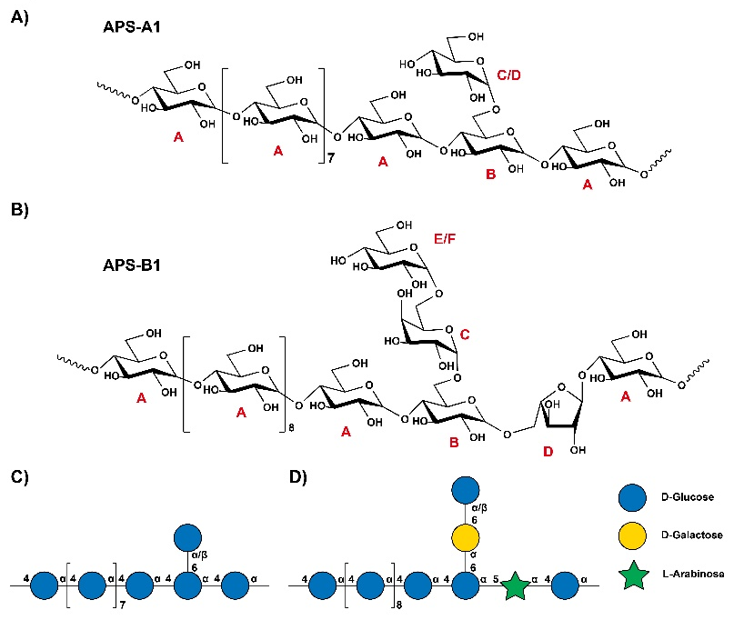 为了进一步解析APS-A1和APS-B1的结构,通过1D-NMR(1H和13C)和2D-NMR(COSY、HSQC和HMBC)进行了分析,并结合甲基化分析结果,推测了它们的可能结构。APS-A1的骨架是1,4-连接的α-Glcp,一些1,4-连接的α-Glcp的O-6处连有α/β-Glcp残基附着在主干上。APS-B1的骨架是1,4-连接的α-Glcp,夹杂着1,5-连接的α-Araf,一些1,4-连接的α-Glcp的O-6处有1,6-连接的α-Galp,这些末端被α/β-Glcp残基取代形成分支。