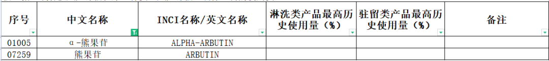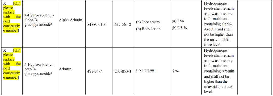 其中,规定熊果苷限用浓度为7%,α‑熊果苷在面霜中的限用浓度为2%、在润肤露中的限用浓度为0.5%,且所有熊果苷原料中对苯二酚(即氢醌)水平应保持在较低水平。