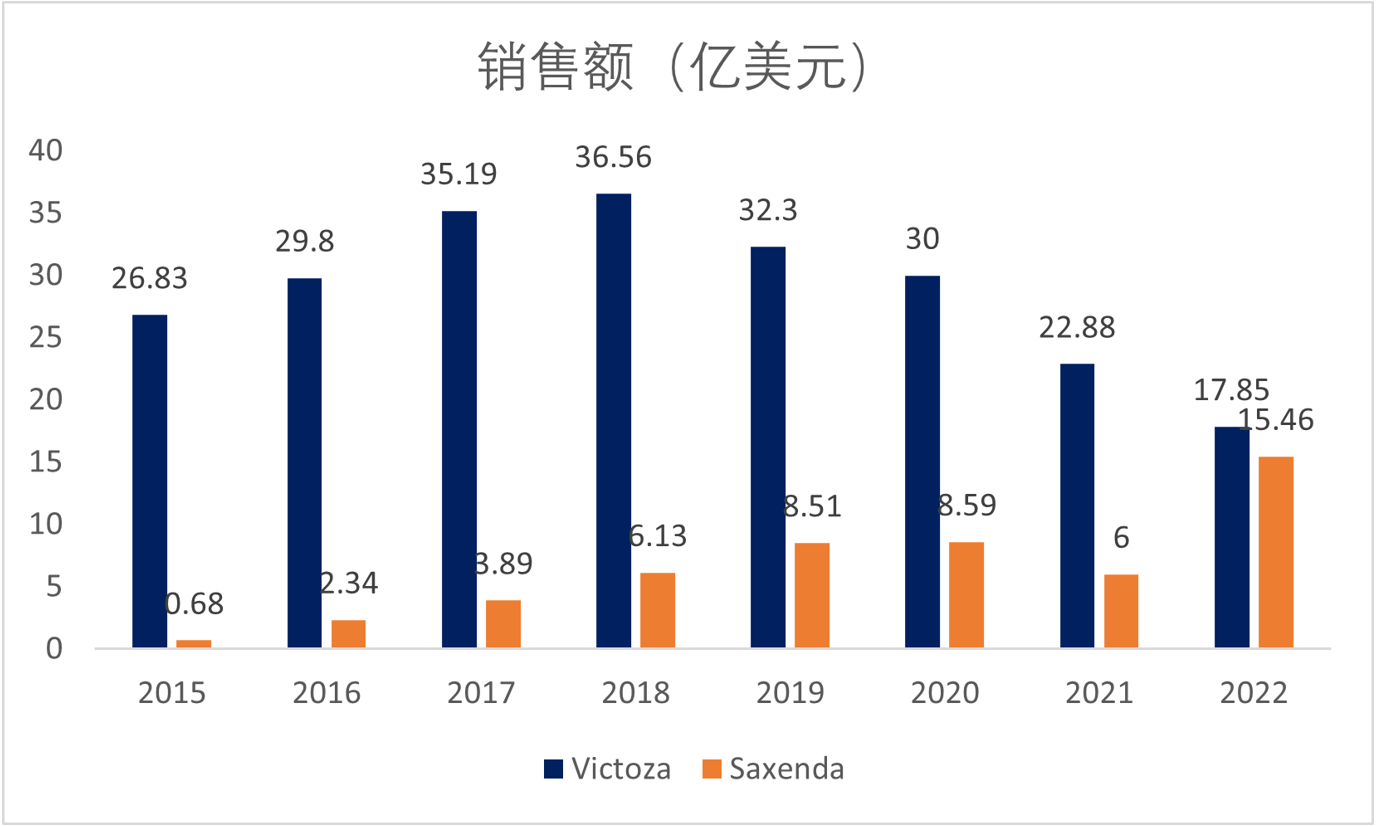 利拉鲁肽降糖药Victoza和减肥针Saxenda的销售额对比