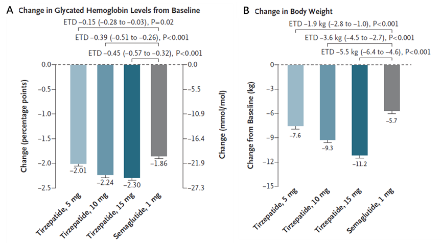 替尔泊肽于2022年5月被FDA批准用于改善2型糖尿病(T2D)成人患者的血糖控制,它是一种长效制剂,每周皮下注射给药一次。并且替尔泊肽于2022年10月19日被FDA授予用于治疗伴有体重相关共病的肥胖或超重成人患者快速通道资格(FTD)。在替尔泊肽与司美格鲁肽的头对头试验中(NCT03987919),替尔泊肽表现出了比司美格鲁肽更为优秀的降糖和减重能力[4]。试验结果显示分别使用5mg、10mg和15mg替尔泊肽糖化血红蛋白水平与基线的估计平均变化为−2.01%、−2.24%和−2.30%,司美格鲁肽则为-1.86%。5 mg、10 mg和15 mg替尔泊肽组,体重减轻幅度大于1mg司美格鲁肽组,分别为:0.15%,0.39 %和0.45%(图10)。