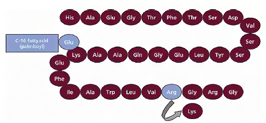 图2. 利拉鲁肽的结构(深红色是人类GLP-1蛋白原有的氨基酸)