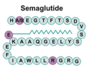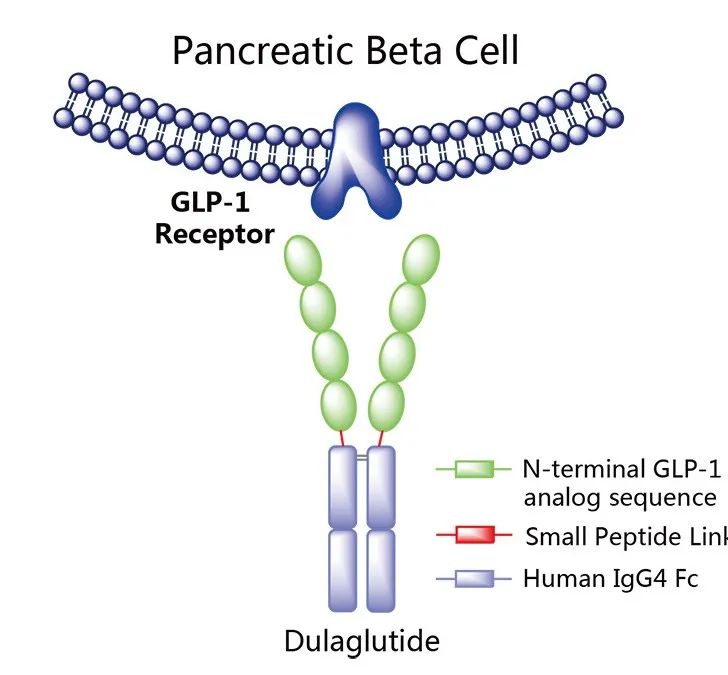 度拉糖肽是由礼来研发的将GLP-1多肽与抗体Fc片段融合形成的,于2014年首次在美国上市,是一款长效GLP-1受体激动剂,每周给药一次(图4)。2019年2月,度拉糖肽在中国获批上市,商品名为度易达,适用于成人2型糖尿病患者的血糖控制,包括单药以及接受二甲双胍和/或磺脲类药物治疗血糖仍控制不佳的患者。