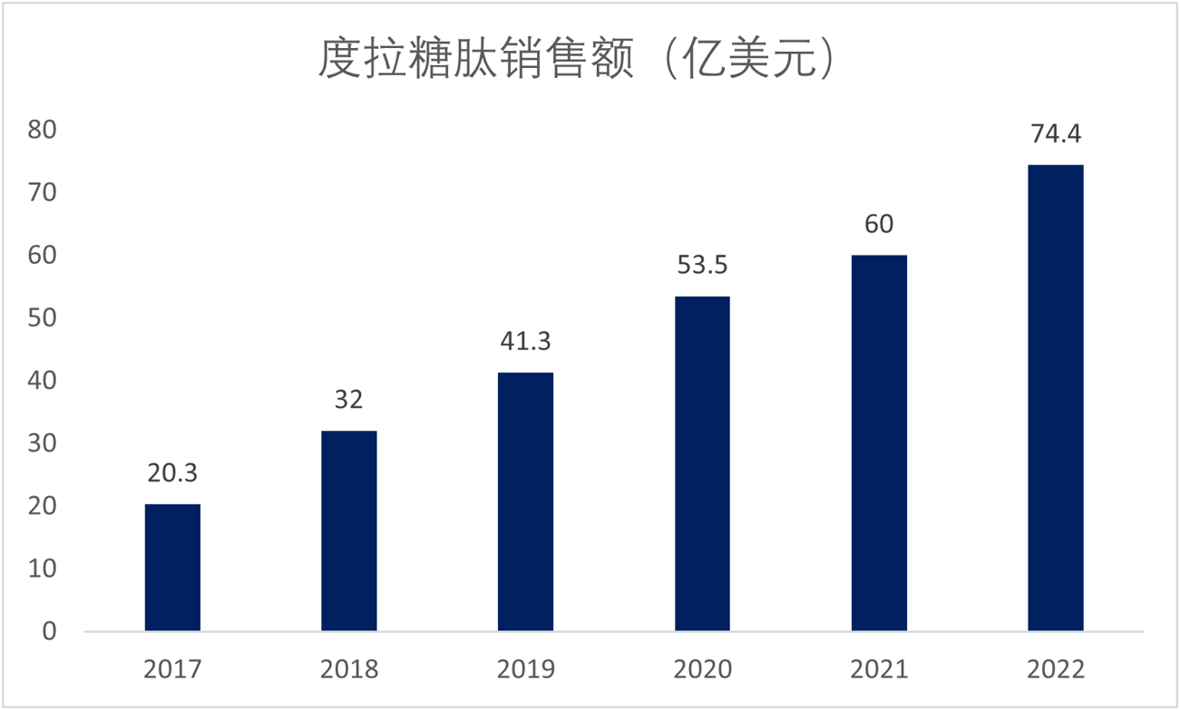 度拉糖肽自2014年获得FDA批准以来,市场份额扩张迅速,2018年销售额约32亿美元,已经接近GLP-1王牌产品利拉鲁肽。2019年,度拉糖肽全球销售额达到41.3亿美元,为全球GLP-1销售冠军,占其市场份额39%,并位列全球药品销售额TOP100榜第19位,2022年销售额达到74.4亿美元,但是销售额还是被司美格鲁肽超越了(图5)。