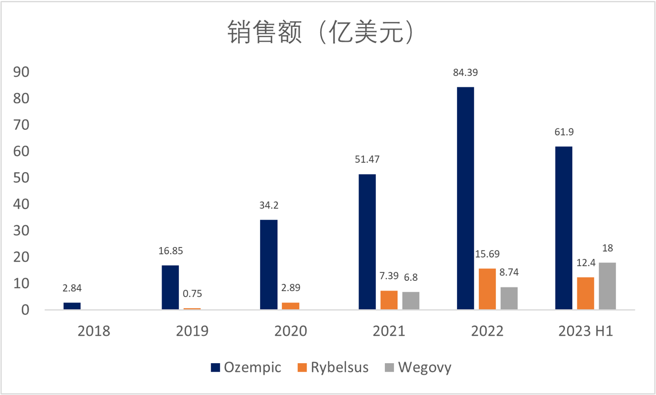 然而好景不长,度拉糖肽的销冠还没坐多久就被司美格鲁肽终结,司美格鲁肽在头对头试验中打败了度拉糖肽和利拉鲁肽,得益于肥胖症的获批2022年司美格鲁肽各种形式销售额总和突破百亿美元,成为GLP-1类药王。近期诺和诺德发布半年报,三款司美格鲁肽产品上半年共计销售92.2亿美元,全年有望突破200亿美元,增长速度惊人。