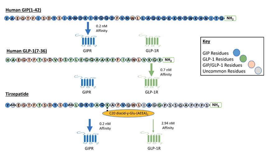 替尔泊肽(tirzepatide,Mounjaro)是由礼来研发的首款获批的GIP/GLP-1受体双重激动剂,是一个39个氨基酸长的多肽分子,经过对天然的GIP上20位的赖氨酸中,增加了一个20碳的脂肪酸和替换2和13位上的精氨酸为2-氨基异丁酸(Aib)修饰而得,阻碍DPP-4降解以及能更好地和白蛋白结合延长半衰期,其半衰期大致为5天(图9)。