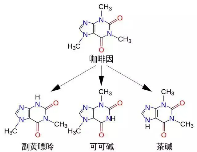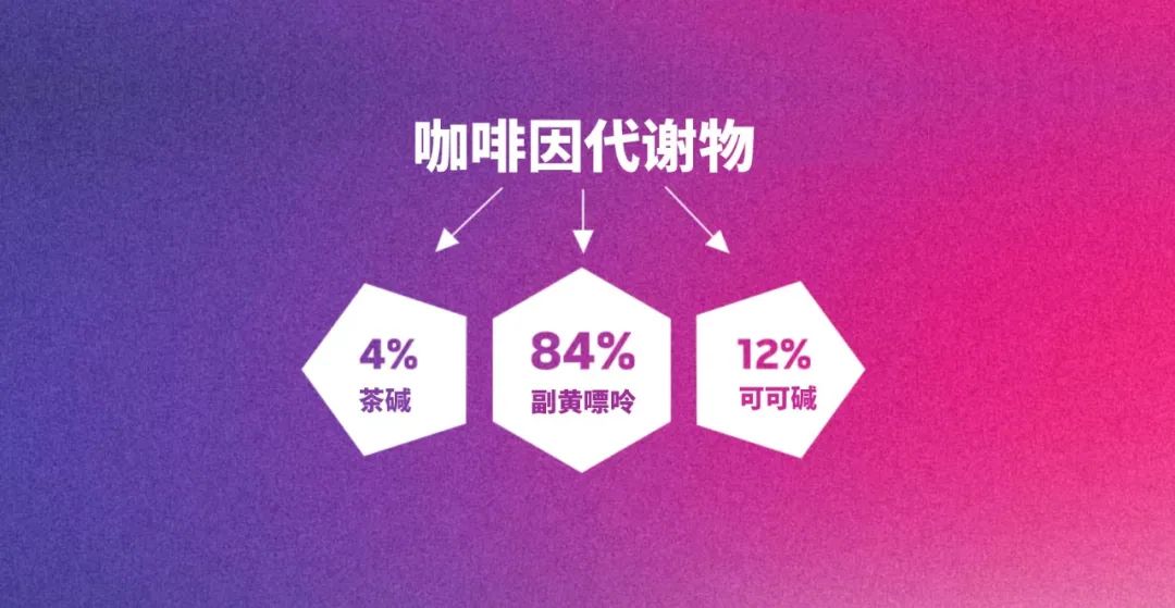 咖啡因进入体内需要经历“吸收→代谢分解”的过程,咖啡因主要分解为三种代谢产物:茶碱、副黄嘌呤和可可碱,这三种代谢产物的比例和功效各不相同(如下图),其中占比最大的成分是副黄嘌呤。