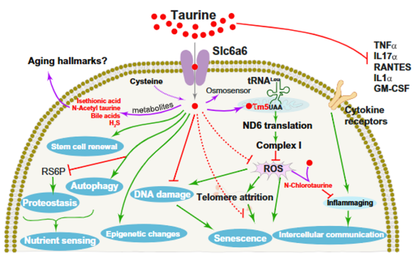 牛磺酸在体内可以利用蛋氨酸和半胱氨酸为底物在肝脏中经催化反应进行内源性合成,但是合成能力会随年龄的增长而降低。人群研究表明,20岁时的合成能力处于顶峰,随后血液中牛磺酸的水平会逐年下降[2]。由此可见,通过膳食摄入途径补充牛磺酸至关重要,人体摄取牛磺酸是以含量丰富的鱼贝类海产品及肉类食品为主。在我国,根据《食品安全国家标准 食品营养强化剂使用标准》(GB 14880-2012)、《食品安全国家标准 运动营养食品通则》(GB 24154-2015)等标准规定,牛磺酸作为一种天然或人工合成的食品营养强化剂,既可以作为保健食品原料,也可以应用到普通食品(包括运动营养食品)中。国际上,牛磺酸获得美国FDA的GRAS认证,用作强化水饮料的成分;在日本,牛磺酸被列为不影响人体健康的物质;欧盟批准牛磺酸作为能量饮料的成分使用。据中金企信国际咨询数据显示:2019年牛磺酸总规模在11亿元左右,预计2026年达到15亿元,年复合增速达到4.5%。牛磺酸主要应用于食品和宠物食品等领域,据观研天下的报告显示,牛磺酸在饮料行业、宠物食品、保健食品领域、饲料行业的应用比重分别占45%、14%、30%及8%。 牛磺酸是怎么做到延缓衰老?牛磺酸在体内不参与蛋白质合成,但它在许多生理过程中都发挥着重要作用,例如缓解体力疲劳、保护视力、增强免疫力、脂质代谢调节、保护神经系统、改善记忆、保护心血管系统等。一篇发表在《Cell》的综述首次创造性的提出了衰老的十二个标志:基因组不稳定、端粒损耗、表观遗传改变、蛋白质稳态丧失、大自噬失能、营养感应失调、线粒体功能障碍、细胞衰老、干细胞耗竭、细胞间通讯改变、慢性炎症和生态失调[3]。令人兴奋的是,Vijay K. Yadav团队研究发现牛磺酸能减少细胞衰老、保护端粒酶,抑制线粒体功能障碍,减少DNA损伤,并减弱炎症反应,为延缓衰老提供了新的可能策略,那么具体又是如何运作的呢?实验表明,牛磺酸的浓度随着衰老而下降,然而补充牛磺酸使雌性小鼠的平均寿命增加了12%,雄性小鼠增加了10%。为了探究牛磺酸的缺乏是否是驱动衰老因素,研究人员验证了牛磺酸对抗衰老的多种机制。